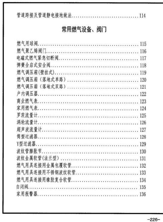 3.10本圖集“常用燃氣設(shè)備、閥門”列示了常用閥門、調(diào)壓箱、計量表等,根據(jù)最新國家規(guī)范的要求,增加了燃氣用具連接用不銹鋼波紋管、燃氣輸送用不銹鋼波紋管,自閉閥等國家規(guī)范要求或推薦使用的材料。由于市場上燃具和用氣設(shè)備種類繁多、更新?lián)Q代較快,故取消了原燃具和用氣設(shè)備圖示。